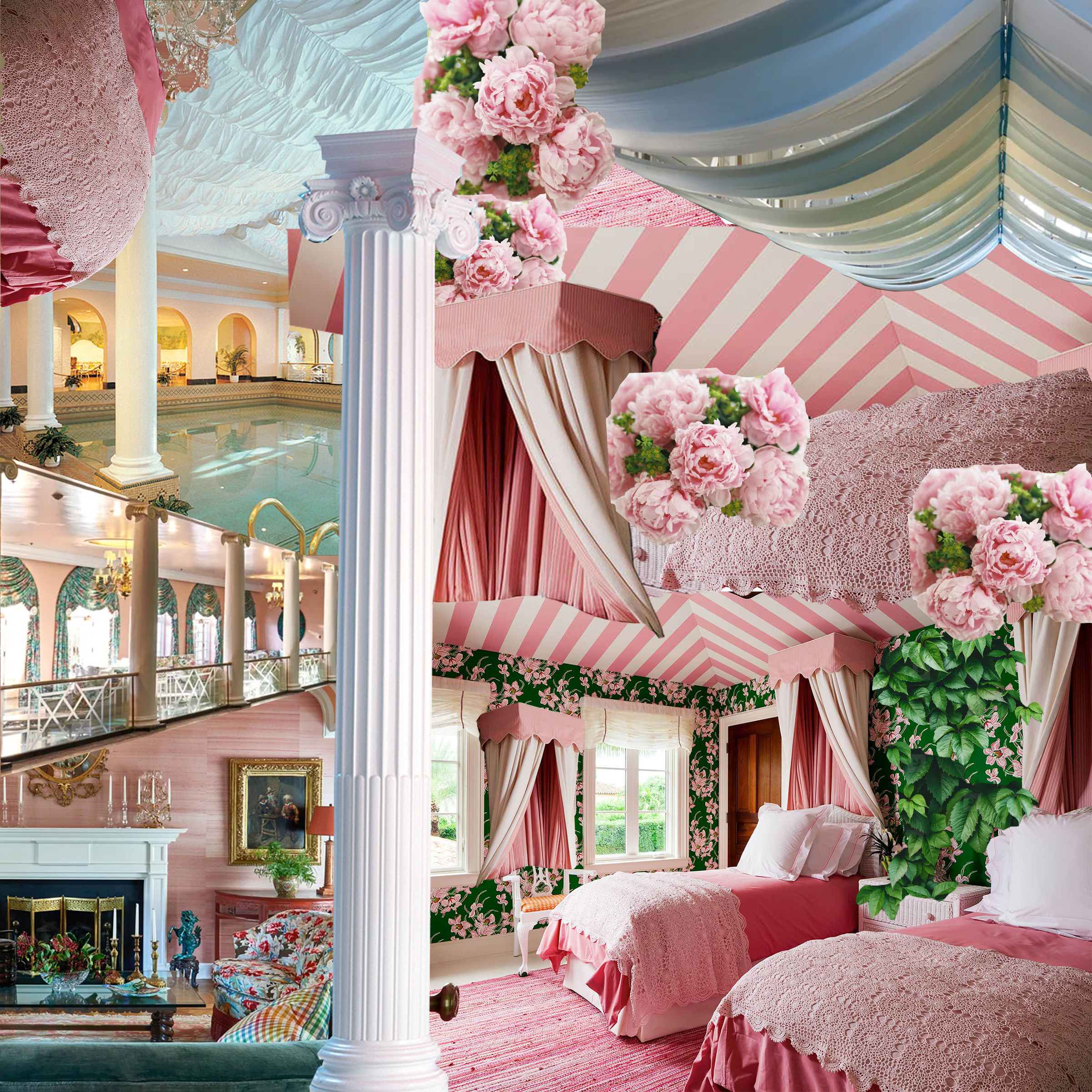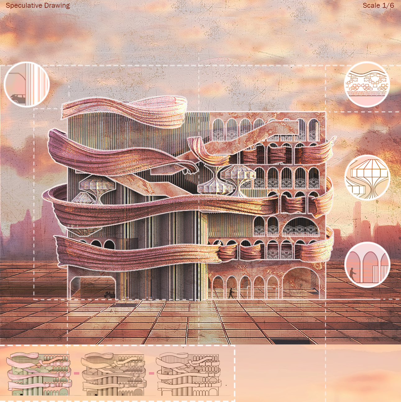 Our project was inspired by the materiality within the ostagram image. Our concept art was inspired by maximalist artist Dorothy Draper, who utilized vibrant colors and soft, flowing textures of flowers and fabrics. We translated the fabric of the curtains from the concept art into a program of balconies wrapping around the structure. The materiality of the “fabric” is ambiguous, creating an appearance of fluidity through rigid structures of balconies and patios.